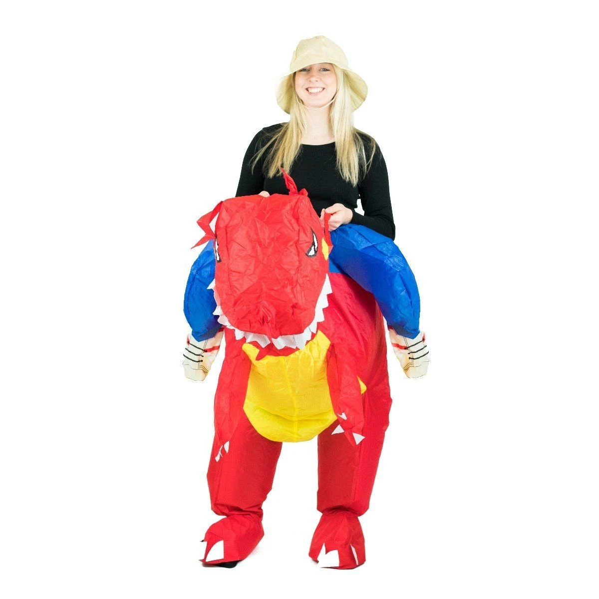 Breath fireย withย ourย adultย inflatableย dragon costume! This funny ride onย dragon fancy dress comes with a freeย hat to complete the look! Suit up with ourย blow upย outfit!